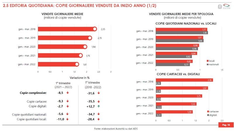 Secondo l’Agcom, inoltre, “appare opportuno osservare come la distribuzione delle vendite di copie digitali appaia maggiormente concentrata rispetto a quella cartacea: le prime cinque testate del segmento digitale rappresentano poco meno del 60% delle copie complessivamente vendute nel primo trimestre del 2022, mentre il corrispondente valore per la versione cartacea quasi si dimezza (34,4%)”.