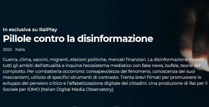 Per questo motivo la Rai è scesa in campo con determinazione nella lotta contro il proliferare di fake news online. In occasione dell’International fact-checking Day (giornata internazionale della verifica dei fatti), che si celebra il 2 aprile, Rai Play ha inaugurato una nuova serie di Pillole contro la disinformazione: 11 brevi filmati monotematici che dallo scorso 4 aprile appaiono nel palinsesto di tutti i canali Rai, pensati apposta per “promuovere l’alfabetizzazione digitale e lo sviluppo del pensiero critico”.